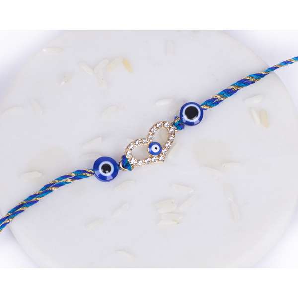 Elevate the spirit of protection and love with our exquisite Evil Eye Heart Rakhi. Crafted with precision and care, this rakhi is a symbol of strength and devotion. Adorned with the powerful evil eye motif and a heart charm, this rakhi is a timeless piece perfect for celebrating the bond between siblings.